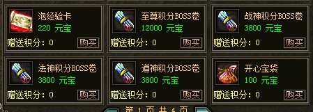 12000元宝的“至尊积分boss卷”是25各职业积分+随机掉落积分,最高每个职业35分