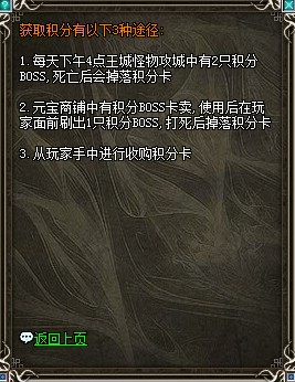 PS:每天下午4点王城怪物攻城内增加2只积分BOSS怪"至尊积分蜂卫",会掉落大量积分卡(该BOSS掉落物品无物品保护时间,任何玩家均可拾取);