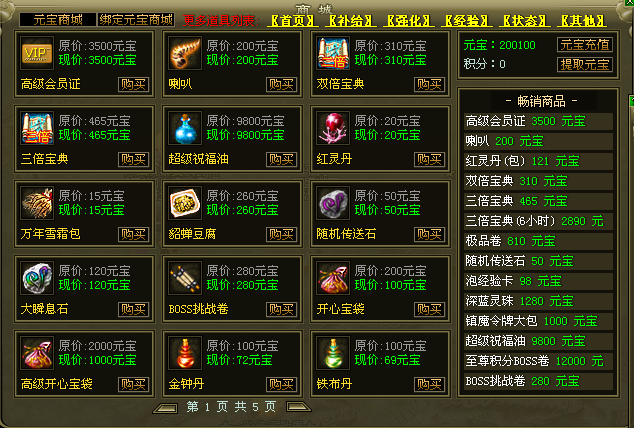 元宝商城:一些销量好,性价比高的道具将会出现在元宝商城中,元宝商城中的热卖物品还会不定期的进行打折优惠活动。