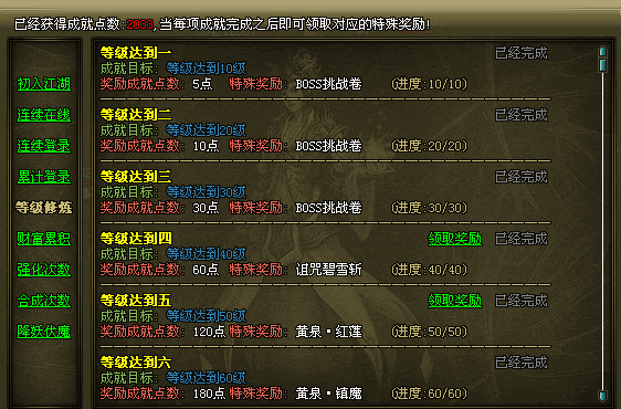 傲视千雄人物头像下面有个“成”图标,点击打开就是成就系统。成就系统会记录你和傲视千雄走过的点点滴滴。从你第一次杀怪到第一次杀人。从第一位好友到第一次加入公会。从等级十级到达到90级。 如果成就完成就可以获得相应的奖励。 降妖伏魔人物 可以领取功德值哦!
