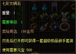 五百元宝,用在这里一点都不亏,因为这身装备就够你在40之前升级比别人快了。使用后将开出祝福油3瓶,极品新手套装一套。