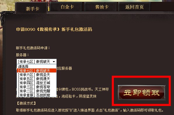 现在傲视千雄新手礼包改变了激活方式,不再是在官网激活了哦。需要在官网那个提取激活码,然后进入游戏激活。