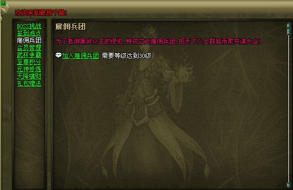4、等到46级后升级就会出现一个瓶颈了,就靠每天的任务来获取经验了。在这期间要尽量提升佣兵等级(按快捷键G选择雇佣兵团提升用佣兵等级),积攒镇魔令,有足够的镇魔令后就可以去刷一次镇魔塔,也能获得很多的经验。元神等级也必须尽量提升,除了300W的经验补偿外,有些高级装备也是要求元神等级的。也就是说到了46以后就靠每天的积累升级了。要是有一定的绑定元宝的话还可以去做每日任务,不过作为小RMB玩家,那个任务最好就在10层以内,因为那个会消耗掉很多的绑定元宝。就这样不断的积累,差不多不要一个星期就可以到50级了。就不用再太纠结等级了,进入一个好的行会,为装备和兄弟们去打拼吧!!