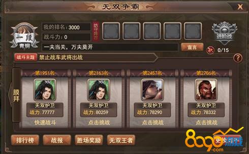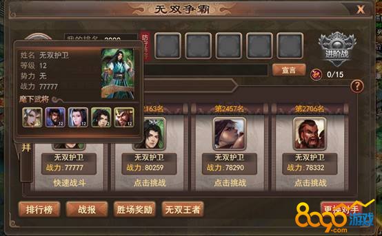 搜索"8090网页游戏"8090《傲视无双》游戏在28级开放无双争霸系统,通过演武场可进入无双争霸界面。首次进入无双争霸时需先设置防守阵容队伍。
