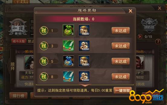 点击头像下方的“点击挑战”按钮,将弹出挑战布阵界面。挑战胜利后,将获得大量铜钱奖励。