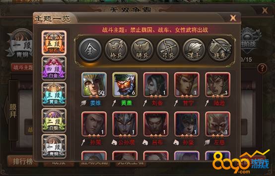 每一期无双争霸均有不同的战斗主题,主题将限制本期争霸可上阵的英雄,点击主题一览即可查看本期战斗主题。