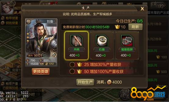 在工匠坊中可生产武将训练材料,生产时需放入执行武将,执行武将品质越高,生产出的材料越多,升级工匠坊可提升材料品质及生产数量