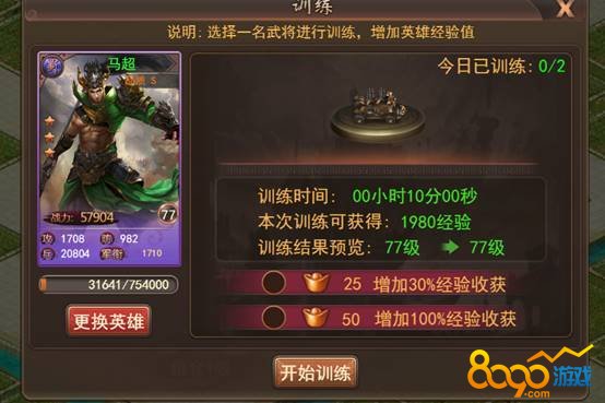 校场中可进行武将训练,训练完毕后该武将可获得大量升级经验,升级校场可提升经验获取量