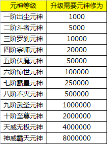 元神升级需要元神修为对照表