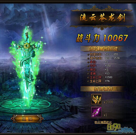 搜索"8090网页游戏"傲视战神道士的神器共有四种,之前为各位介绍过昊天镇魂剑,今天小编就为各位介绍一下道士的三阶神器-流云苍龙剑。