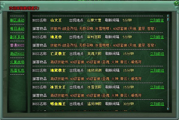 很方便吧,不管是什么BOSS 地点,刷新时间,所爆装备,还有自动寻路一应俱全哟.
