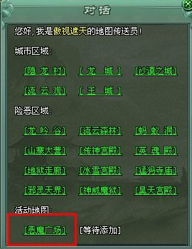 有不少新手玩家还不知道恶魔怎么去,其实很简单,隐龙村和龙城的地图传送员都可以直接传送到达,只要在活动时间与传送员对话即可。