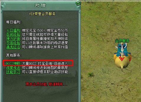 傲视遮天的VIP有一个专属的打BOSS地图,这个地图就是BOSS神殿。里面有很多单人可以击杀的小BOSS,这些BOSS不仅可以让你获得很多初期的好装备,还因为它的BOSS数量多。更是玩家们刷自己元神的好去处哦。