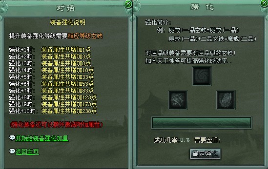 但让如果你老是强化失败的话,我就建议您去商城购买天工神符.加大强化的几率~在后期强化几率较小的的时候用起来很不错哟~~~