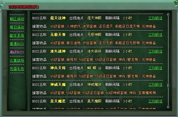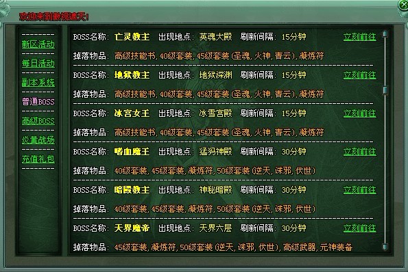 没有哪个装备是整整50级穿戴的,往前一点有49级能穿齐的装备,包括逆天套装(战士)、诛邪套装(法师)、伏世套装(道士),这些装备的出处还是很多的,比如属于普通BOSS一列的嗜血魔王、暗殿教主、天界魔帝等,这些BOSS在右上方“活”字当中普通BOSS那栏里面都有介绍,会员玩家点击立刻前往就会直接飞往BOSS刷新点。除了这些普通BOSS以外,高级BOSS也都会掉落这些装备,包括:蚩魔、五大后宫BOSS、三大神、迷失战神、神兵天将、神威天魔、昊天魔君以及恶魔广场二层三层主要BOSS等。
