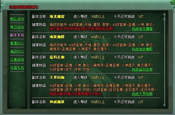每个等级的副本都有,而且还不知挑战一次哟,让你爆装备的几率大大增加了呢.