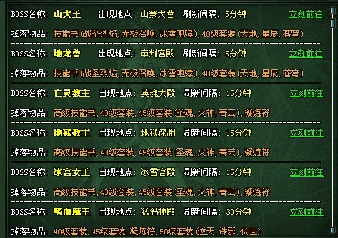 亡灵教主 地狱教主 冰宫女王 这三个BOSS基本上爆率就大一点了.是出三大职业,战士 法师 道士 45级套装的BOSS也是你从前期到后期的国度装备的出处.