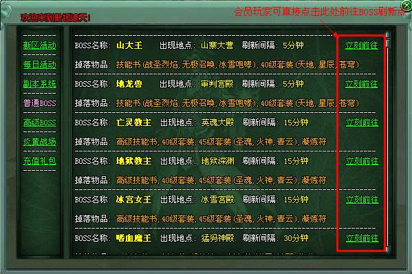 9.会员自动寻路功能 :会员玩家可直接点击此处前往boss刷新点