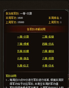 每周日的23点59分,根据玩家本周获得军功的排名,给予玩家对应的军阶,结算后本周的军功将清零。结算后,本周排名前五的玩家将会通过邮件获得军阶排名礼包,本周军功低于2500的玩家无法获得军阶。