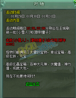 怪物好礼来袭的活动时间持续3天,分别是1月29号,30号和31号,在这段时间内,每天总共有两个时间段会刷新活动怪物,您只需击败活动怪物就会出现新年boss,boss身上携带了海量道具材料,元宝当然不用说,还有神力值和玄晶等等。