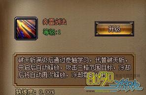 当您的破天斩学到满级之后就可以学习奔雷剑法了,通过卷轴即可习会,作用是代替破天斩,开启之后自动释放,攻击周围三格范围内的一切目标,冷却之后自动再次释放,奔雷剑法冷却时间为10秒。