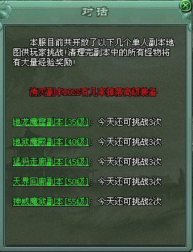 早傲视遮天中,有没有想过在不经可以一个人打BOSS爆装备,而且又有巨额经验的领取呢?而且是每天都有哦,是不是很诱惑,是不是已经很激情的想跃跃欲试了,下面小编告诉大家,在傲视遮天中,这一切都不是梦想,而是可以实现的,只要每天玩家们到龙城的的单人副本挑战使者那里去挑战就可以,等级越高挑战的副本越多。BOSS爆出的装备也就越极品。最高等级的55级副本还可以挑战遮天中的最大BOSS。
