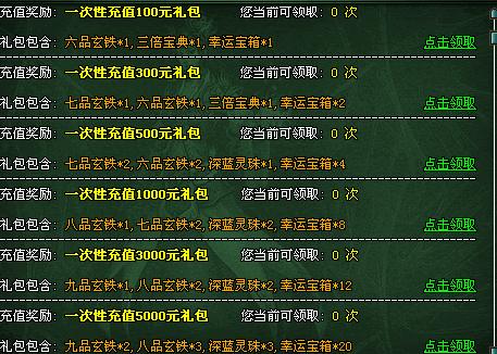 【活动内容】本服所有玩家第一次为帐号充值时,无论金额多少,都可以领取一份系统赠送的丰厚回礼。(每个帐号只能领取一次)
