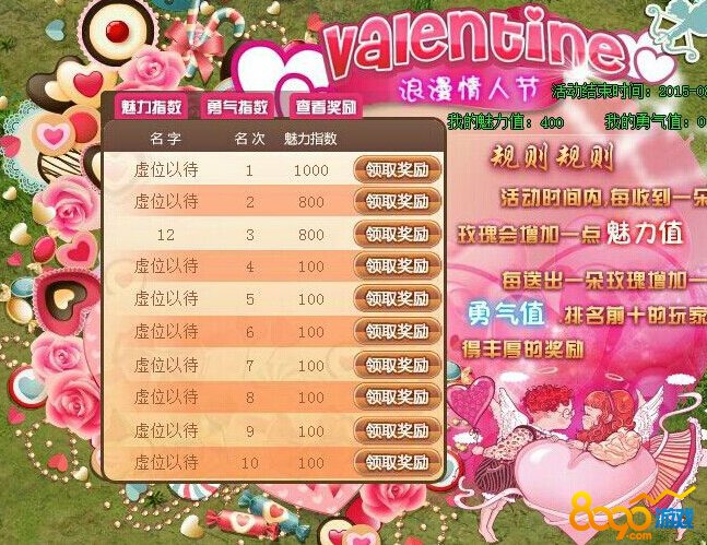 【活动规则】活动时间内每收到一朵玫瑰会增加一点魅力值,每送出一朵玫瑰增加一点勇气值。活动结束后按照排名,前十的玩家会获得丰厚的奖励。