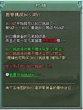 副本介绍:10级以上可以挑战,从10级-70级,每间隔5级可挑战不同的BOSS,每天每人可挑战3次,每次挑战时间为10分钟。