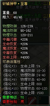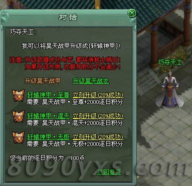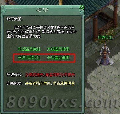 辕神剑和轩辕神甲,由鸣鸿刀和昊天战甲升级,可在龙城【天工巧匠】NPC处升级: