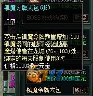 首先是镇魔塔,这个大家都知道打完12层,奖励和经验都是非常多的。每天的绑定元宝可以使用三次100的镇魔令牌,在加上5次的10的。那么也就是2天能够爬一次塔。