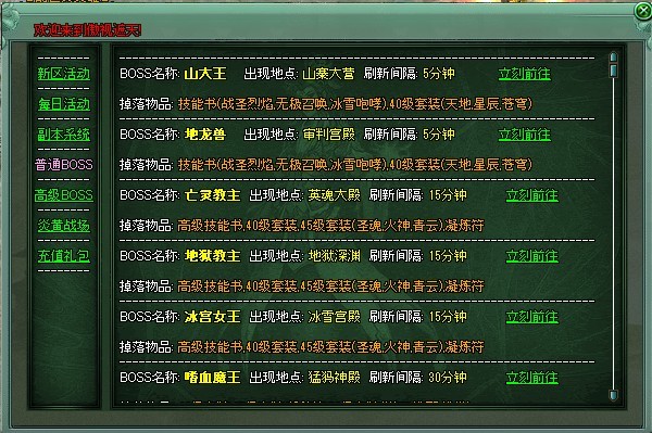 这个副本系统是没有时间限制的哦,但是各位要认真看清楚哦,它是有次数限制和等级限制的哦。千万别把能打到高级装备的副本次数给浪费了哦。普通BOSS,高级BOSS还有炎黄战场都是升级打极品装备的好去处哦。