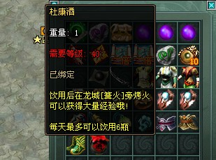 玩家到达40级之后,就可以饮用杜康酒,并在篝火边烤火得经验了!杜康酒会在打怪过程中掉落,也可以从商城购买。每瓶杜康酒使用之后可以获得三十分钟烤火的经验的时间,每人每天最多可以使用六瓶。每天的11:30~12:30和18:00-19:00,烤火更有双倍经验获取哦,各位玩家们,你们一定要记得把酒留到经验最多的时候喝,不然浪费了多可惜啊!
