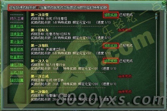 完成成就后点击领取奖励,不仅可以获得成就点,还可以获得绑定元宝奖励