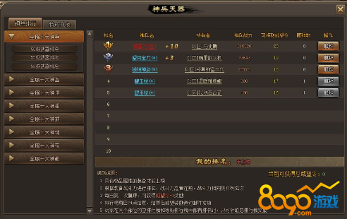 总排行榜:全服十大神兵、全服十大神盔、全服十大神甲、全服十大神镯、全服十大神戒、全服十大神链、全服十大神带、全服十大神靴。