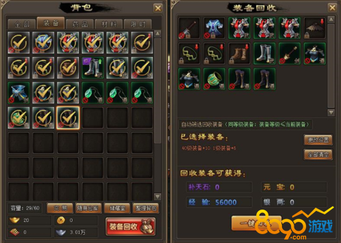 将不需要的装备道具进行回收,可获得元宝、银两、经验、补天石等道具。 装备回收是玩家获得元宝、银两、经验、补天石的主要途径之一。