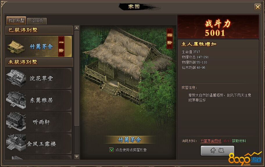 所有玩家初始默认激活“竹篱茅舍”,可通过击败首领掉落家园图纸来激活或升级更多的别墅。