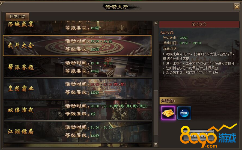 武斗大会是各位侠士之间的比武盛会,8090《傲笑江湖》游戏中,每天晚上19:29-19:50,将开启活动;比赛分为3场,进行匹配.。