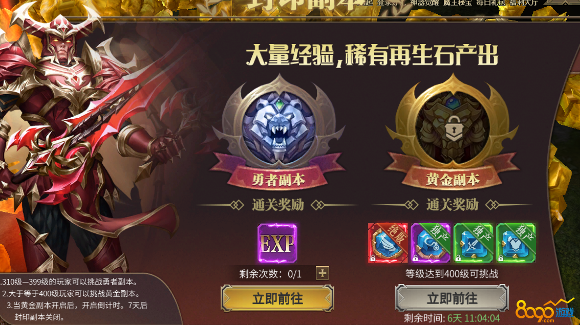 封印副本,在当前区服有玩家达到390级后,第二天即可激活封印副本,310-399级的玩家可以参与挑战勇者副本获得高额的经验,玩家可以通过支付金币再攻略一次副本,一天最多参与两次副本