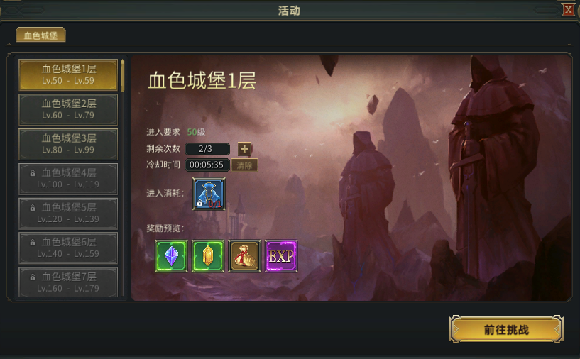 血色城堡一共有48层,每一层都有等级要求限制,当你达到对应的等级就会开放挑战,每天初始有3次进入副本的机会,挑战一次之后会有一段的冷却时间,进入副本需要消耗透明披风,没有的可以用金币购买。