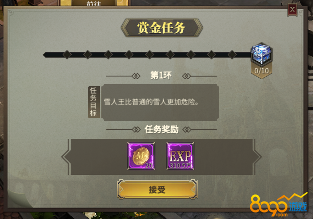 赏金任务一共有10环,大家可以在世界活动中进入赏金任务,选择接受任务之后就开启了赏金任务之路,任务的内容也比较简单,基本就是击杀指定数量的怪物,每完成一个赏金任务就能获得超多的金币和经验奖励,想要快速升级或者缺钱的小伙伴千万不要错过哦。