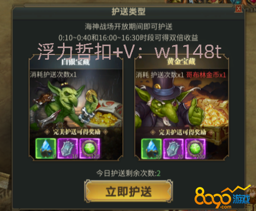 但是需要注意的是,中途如果挂掉了会直接完成护送任务,但会折损运送成功所获得的奖励。在其他玩家护送时,将其击杀的玩家可获取劫掠奖励。黄金宝藏任务接取需要额外消耗哥布林金币,此道具可在商店使用钻石或金币购得。双倍护送期间,护送及劫掠的任务奖励翻倍。玩家护送次数及劫掠次数都将在每日5点重置。