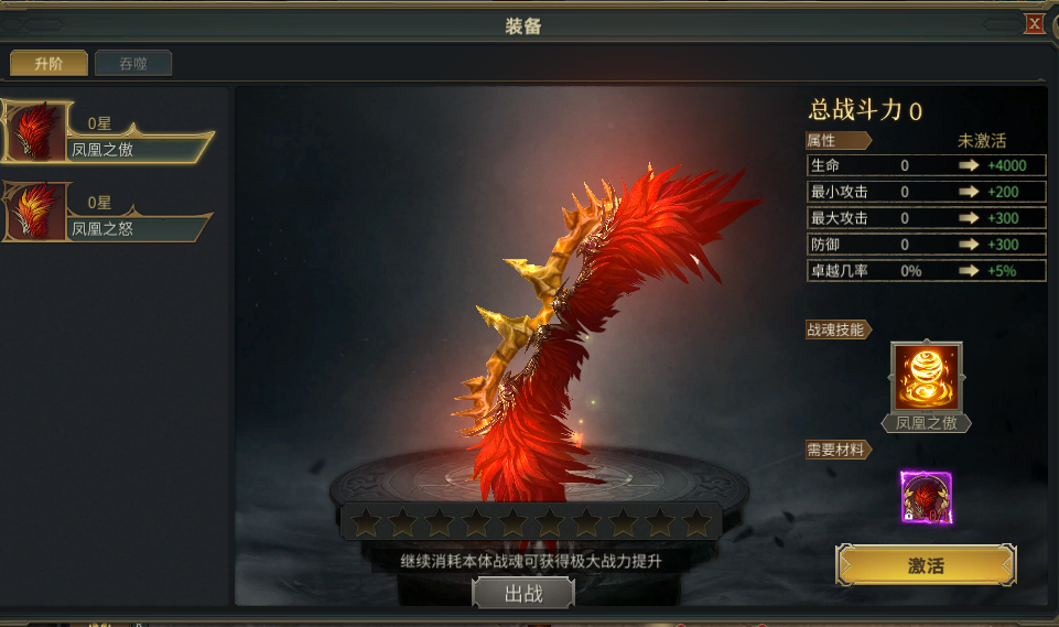 在暗夜奇迹游戏中,战魂装备分为升阶和吞噬两个部分,首先需要激活战魂,激活材料可以通过特殊活动获得,凤凰之傲战魂的基础属性+4000生命,攻击200-300,防御+300,卓越几率+5%。