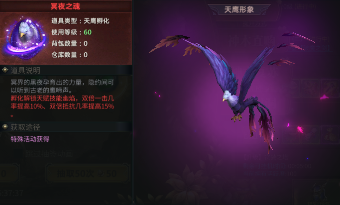 在天鹰神木活动中,消耗神木币进行抽奖求签,神木币可以通过参与神木复苏和神木直购活动获得,还可以消耗钻石购买,有几率抽到冥夜之魂。冥夜焰鹰孵化解锁天赋技能幽焰,双倍一击几率提高10%、双倍抵抗几率提高15%。还有几率获得冥夜进化之魂,可以用于进化冥夜焰鹰。