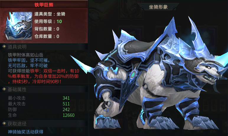 在神骑抽奖活动中,还有0.3%的概率获得超级红色品阶的超级超级铁甲巨熊,是进化的必备材料,需要激活坐骑铁甲巨熊后才可以使用。