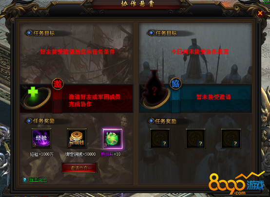 协作悬赏任务在主城安全区姜维处接取,协作悬赏需要玩家与其他玩家协作完成。玩家刷新到自己的任务后,邀请好友或者军团成员一起完成任务,双方都可以获得对应的任务奖励。