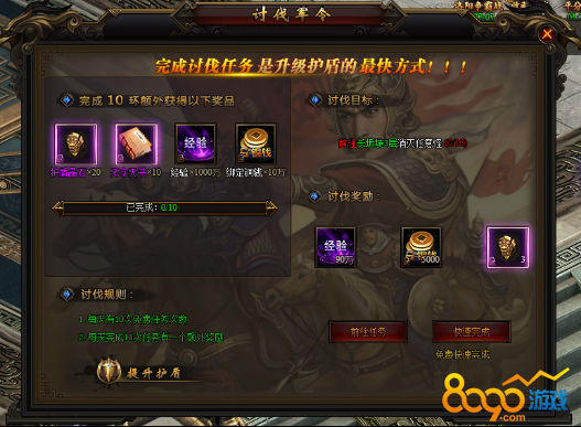 8090《北斗神兵超变版》讨伐军令任务是游戏日常任务,每天可以接取10次,完成讨伐任务是升级护盾的最快方式。
