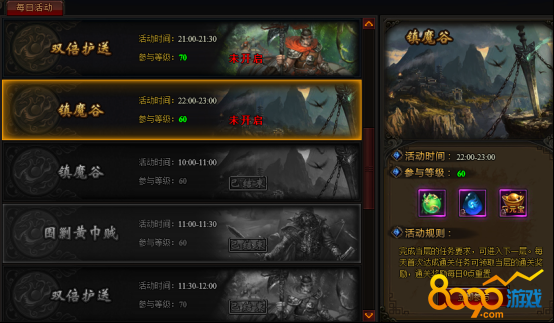 8090《北斗神兵超变版》镇魔谷活动在每天10:00-11:00和14:00-15:00以及22:00-23:00这三个时间段内开启。