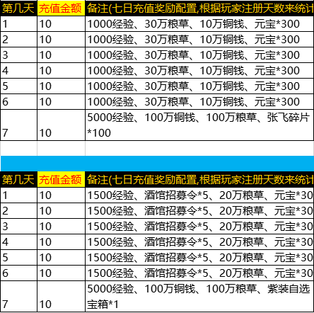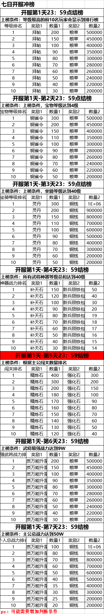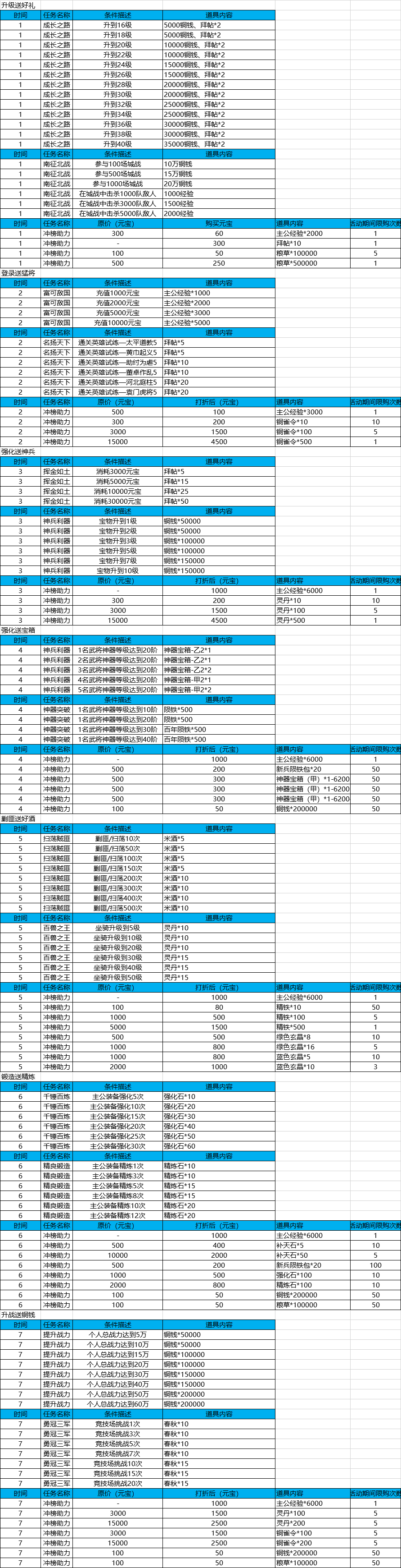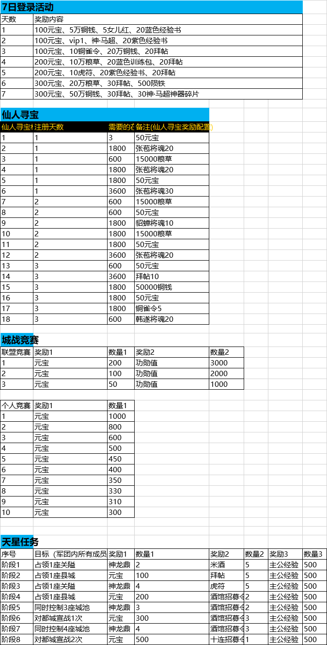 仙人寻宝、7日登录、城战竞赛、天星任务