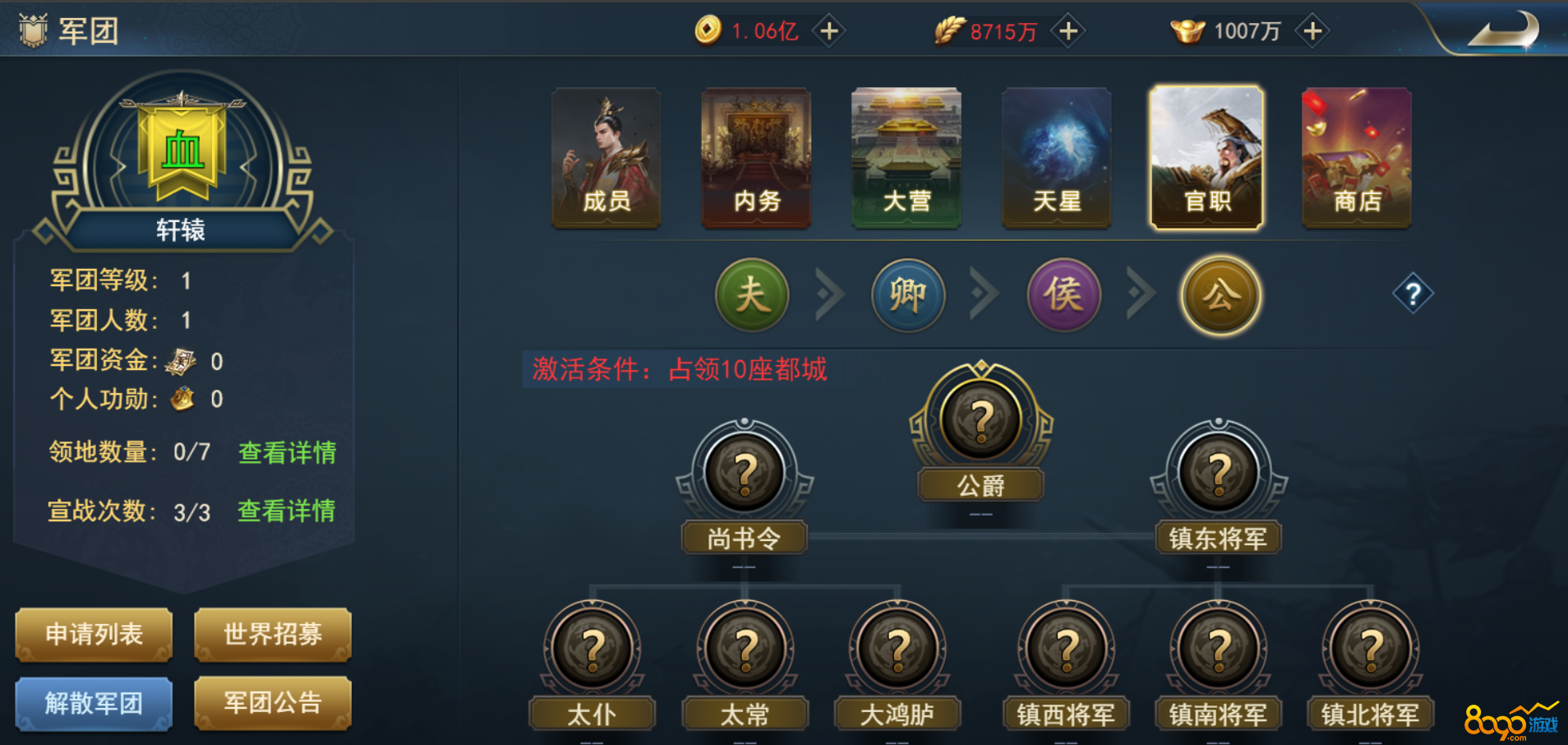 当军团占领了指定数量的城池之后,即可开启等级的官职,军团长可手动任命军团内成员担任官职